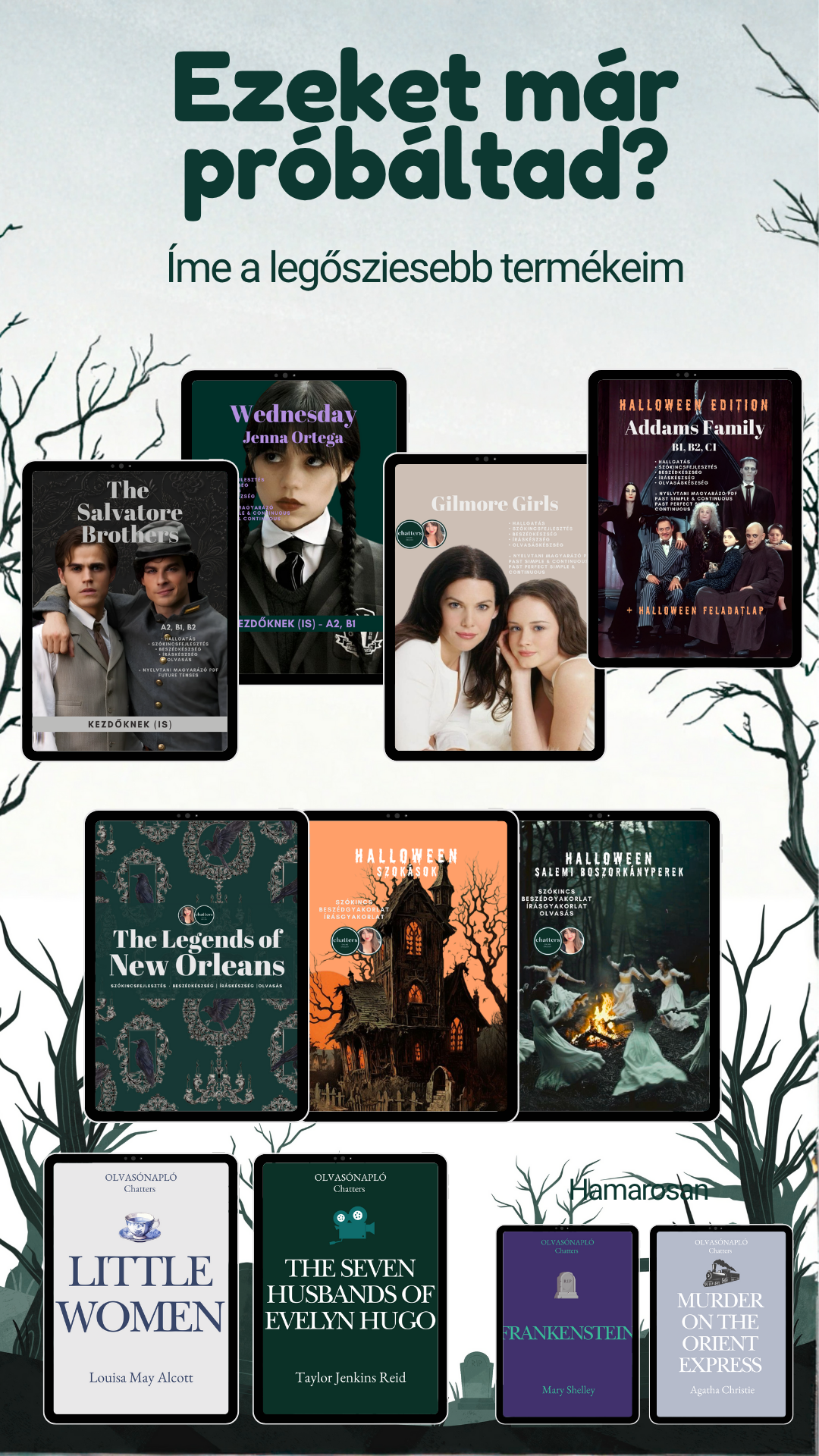 A magánóráim mellett popkultúrára épülő tematikus feladatlapok tervezésével foglalkozom, amelyekkel önállóan, a saját időbeosztásodba beilleszthető módon, de professzionális útmutatás alapján gyakorolhatsz, ráaadásul szórakozva.
